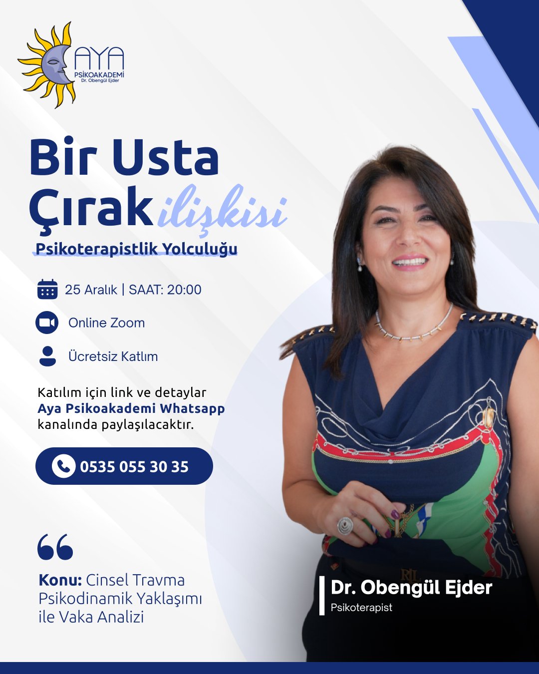 2001 yılında Aile ve Evlilik Terapisi, Cinsel Terapi, Bilişsel Davranışçı Terapi, Bütüncül Psikoterapi, Çocuklarla Oyun Terapisi, Transaksiyonel Analiz, Madde Bağımlılığı, NLP, EFT, Hipnoz, PsikoOnkoloji gibi Psikoterapi eğitimleri almaya başlamış, Çukurova Üniversitesi Eğitim Fakültesi Psikolojik Danışmanlık ve Rehberlik Bölümünde ve Yakın Doğu Üniversitesi Klinik Psikoloji Bölümünde Yüksek Lisansını tamamlayarak Klinik Psikolog ünvanı almıştır. Eğitimin bir ömür boyu sürdüğü inancıyla Psikoterapi alanında okumaya, araştırmaya, yazmaya devam etmektedir.